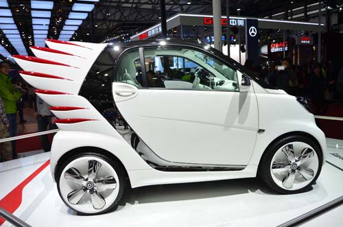 雖然在M.Benz展區擺著重量級的GLA休旅概念車,但沒騙你,其可能還不及這部長著翅膀的Smart來得吸睛。這部很有「科學小飛俠」Fu的飛天座駕名為「ForJeremy」,是Smart與知名時裝設計大師Jeremy Scott合作下的產物,擁有相當搶眼的兩隻翅膀以及飛機螺旋槳造型的輪圈,且重要的是它在上海車展已成為了量產車型,但價格也不便宜,起跳價為3.33萬歐元。