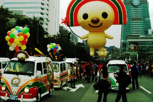 7-ELEVEN表示,跨年活動已是台灣每年年終的盛事,繼去(2006)年首次舉辦超大汽球跨年遊行活動之後,吸引超過5萬人次參與,讓跨年活動氣氛提前炒熱,從當天中午持續到深夜,而今年的跨年遊行除了7-ELEVEN OPEN小將家族12公尺高的大汽球及車隊,今年首次增加Mister Donut的波堤獅、法蘭奇咩咩,以及宅急便的黑貓超大型氣球,讓整個遊行氣勢更為壯觀,還有PLAZA最受歡迎的BARBAPAPA人偶,加上COLD STONE別出心裁的拌冰舞,以及數十支表演團體,將熱熱鬧鬧進行全程一公里的跨年遊行活動。