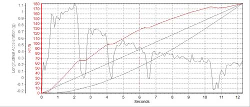 根據D-Box圖表顯示,本車在起步時的G值並沒有一次往上衝,可見打滑情況相當嚴重,不過待215/45/17 R888確實抓住地面後,瞬間G值衝破1.1G,可見加速力道相當不錯,時速65km/h換上二檔、100km/h換上三檔、130換入四檔這幾個檔位都相當順暢,不過時速170多換入五檔的時候稍慢導致時速下滑,最後400m耗時12.41秒,這樣的表現還有進步空間才對。