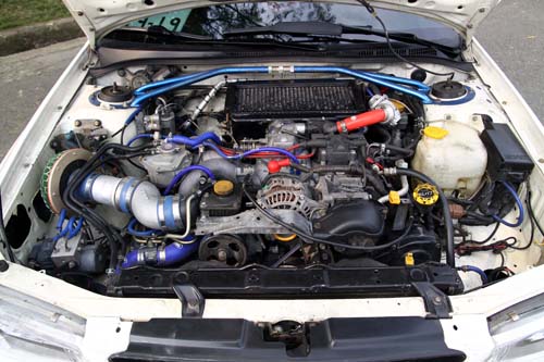 | 本車採用原廠EJ20引擎腹內並未強化,僅針對進、排氣周邊予以昇及,渦輪部分也只換上與原廠大小差不多的VF28,在1.0bar的最大增壓值下約能發揮250hp的最大動力。 |