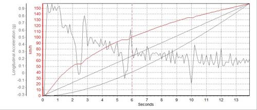 雖然動力不大但測試時車主起步彈射相當漂亮,將近有1G的加速力道,但時速55km/h換檔前出現斷油現象稍微影響了成績,換上二檔後G值再度衝上0.8G但隨即維持在0.5G-0.4G之間,而三、四檔的G值則是平均的維持在0.3G左右,雖然本車動力改裝幅度不大,但最後成績為13.99秒,而末速度稍慢僅有159.8km/h左右。