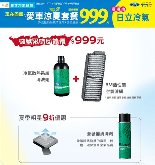 夏季酷暑即將來臨,Ford QualityCare特別推出「愛車透心涼」免費夏季健檢活動!即日起至8月31日止,只要回廠即可享有免費冷氣系統、風扇運轉、冷媒高低壓及冷凝器檢查等九大項目健檢,還可參加「日立分離式冷氣」週週抽好康活動!讓您今夏無論開車出遊或是居家樂活都暢快清涼!QualityCare 為回饋廣大車主,更推出涼夏明星商品限時優惠套餐:「冷氣散熱系統清洗劑和3M活性碳空氣濾網組合」破盤價只要999!廣受歡迎的「蒸發器清洗劑」再享9折優惠!讓車主們不僅今夏清涼,更擁有健康的空氣品質,在炎炎酷暑中,和全家人或朋友們享受絕佳的悠活旅程。