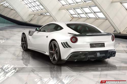 雖然說Ferrari F12 Berlinetta早已是當代超級跑車的指標車型,不過對於頂尖改裝廠而言這卻只是「升級」的開始,為了提升F12 Berlinetta的整體性能與戰力,Mansory特別針對引擎、空力套件與底盤套件進行強化,首先6262c.c. V12引擎經過ECU程式重新撰寫,加上高效能排氣系統使得最大馬力由740hp增加至775hp,扭力則是達到73.9kgm。配合動力提升Mansory提供全新開發的碳纖維空力套件,重新造型設計的前保桿不僅加大進氣壩以提高冷卻效能,同時下擾流也可增加車頭下壓力,此外側裙、尾翼與後下分流器也有助於車尾穩定性。另外針對底盤方面,前21後22吋輕量化鍛造輪圈與255/30及335/25性能胎以提供更好的抓地力及操控表現。為了滿足消費者的個性化需求,Mansory提供座艙進行改裝,包含碳纖維與頂級皮革皆可採用。