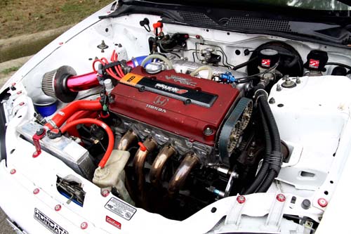 CIVIC的改裝相當多樣化,而本車的改裝方式相當特殊,採用排氣量較小的高轉取向的B16B為基礎,但腹內卻大刀闊斧的植入美國零四專用的大缸套將缸徑擴增到一拜,並使用CP高壓縮比鍛造活塞(達13.5:1)與BC強化連桿來提升剛性,此外,曲軸部分則使用店家的機密套件,使得排氣量提升到2.2L的水準,並輔以BC高角度凸輪軸來增強上座的效率,車主估計動力至少有200hp的輸出。