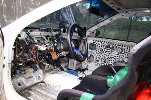 | 內裝部分包括中控台完全都予以拆除外,就連車門鈑金內側也鑽上密密麻麻的洞來偷輕,再配上2.2L大排氣量的加持,零四加速成績相當亮眼。 |