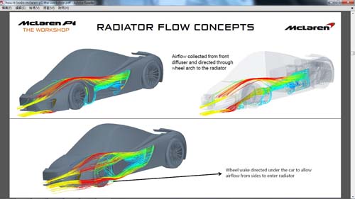 | 水箱散熱氣流概念,(上)流經車身上方與前輪拱排出的氣流經整合而進入車身後方的集氣口而增加散熱效能,(下)從車身側面與輪拱間係流出的氣流也能夠進入後方的集氣口而增加散熱。 |