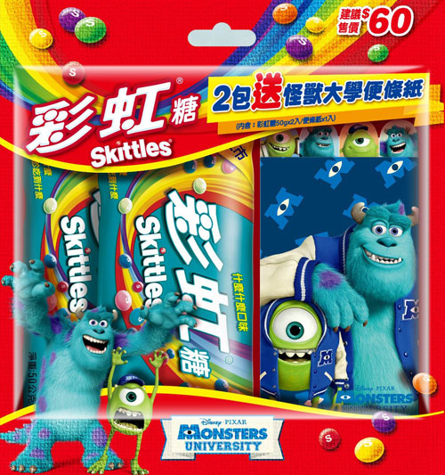 Skittles®彩虹糖自即日起於全省限量販售:「Skittles®彩虹糖怪獸大學開嘴盒」,討喜的外盒包裝上,可愛的毛怪正在大口張嘴Say Hello!有趣的令人愛不釋手,同場加映「Skittles®彩虹糖怪獸大學-毛怪限量包」以及「Skittles®彩虹糖怪獸大學-大眼限量包」,可愛的大眼仔及毛怪揮旗舉手熱情邀請消費者一同加入Skittles®彩虹怪獸大學的行列!另限量推出:「Skittles®彩虹糖怪獸大學限量包」,並附贈怪獸大學便條紙,上班上課作筆記,快速又方便。搞笑高手毛怪及大眼仔這回換上帥氣迷人的棒球外套,隨時隨地提醒你掌握生活中的每一個重要時刻,精彩生活片刻不漏接!