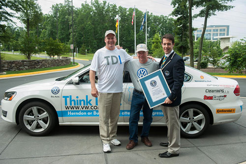此試車小組由一位部落客Mr.Wayne Gerdes以及一位工程師Mr.Bob Winger所組成,開著一輛由Volkswagen美國田納西州Chattanooga (查塔努加)工廠所生產的Passat 2.0 TDI(140匹馬力),成功創下每100公里3.02公升的全新世界紀錄!在試車小組於Herndon(赫恩登)接到世界紀錄證書後,Gerdes發表感言表示:「我們覺得我們有很好的機會用一輛市售的Passat TDI打破現有的紀錄;能夠創下平均77.99mpg的油耗是令人相當振奮的事情 ,而且還是壓倒性的大獲全勝。這同時也展現駕駛人對車輛油耗的影響有多宏大。」先前的金氏世界紀錄成績為每加崙67.9英哩。