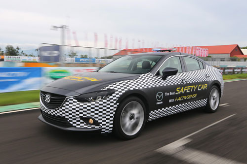MAZDA第六世代跑房車All New Mazda6,上週末開拔前往屏東大鵬灣國際賽車場,擔任內最盛大的汽車賽事活動─「OTGP」安全前導車,動感流線的車身線條雖然經過車貼偽裝,仍吸引在場許多車迷的注目,也成為眾多超跑賽車與改裝性能車中,另類的目光焦點。