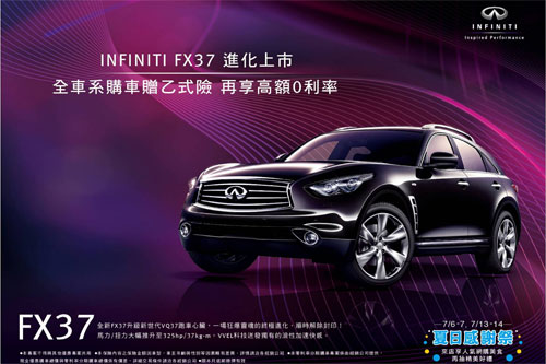 INFINITI 自1989年品牌成立以來,以創新設計與日式精緻的造車工藝,享譽車壇,截至2013年6月份為止,INFINITI全球銷售更已突破220萬台。為感謝消費者一直以來的支持,INFINITI台灣區總代理裕隆日產汽車將於2013年7月份舉辦「夏日感謝祭」活動,來店貴賓除可抽INFINITI獨家精品外,活動現場更將提供包括澎湖春仁黑糖糕、連珍芋頭球等8大熱門網購美食,並安排INFINITI BOSE影音劇院體驗、Show Girl攝影、親子3D立體拼圖等同樂活動,讓貴賓享有賓至如歸的歡樂感受。