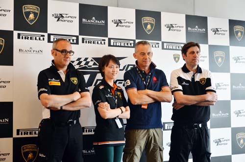 | Lamborghini Blancpain Super Trofeo亞洲負責人Cristiano Inverni、Lamborghini研發中心總監Maurizio Reggiani和寶珀中國市場經理Suki Zhang等人一同為今年首戰拉開序幕。 |