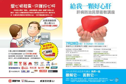 有薦於肝病是我國最大的本土病,且每年約有一萬多國人死於肝病,滙豐汽車投入肝病防治宣導行列,於世界肝炎日(2013/7/28)當天早上,在高雄市三民家商講堂與肝病防治基金會共同舉辦一場免費民眾健康講座《給我一顆好心肝》,期望透過教育正確的肝病及肝癌的防治觀念,讓國人及全體員工更重視自己的健康。