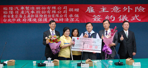 裕隆汽車蕭明輝協理今(17)日代表裕隆汽車及裕隆日產汽車捐贈今年度的「僱主意外責任險」保險金時表示,裕隆汽車及裕隆日產汽車15年來累計為超過2.2萬人次的台北市環保局市民臨時工投保意外險,在他們因工作發生急難時提供實質的家庭濟助,緩解他們所遭逢的困境。