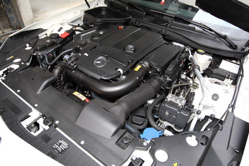 SLK 200搭載的這具1796cc的直列四缸渦輪增壓引擎,可在5250rpm時可發揮184hp的出力表現,最大扭力為270Nm/1800~4600rpm,原廠公佈0~100km/h的加速表現則僅需要7秒整。動力表現可經由排檔桿旁的行車模式按鈕切換,分為重視省油與通勤的E經濟模式、動力隨傳隨到的S運動模式、以及全部由換檔撥片操作的M手動模式,搭配上7G-Tronic Plus七速手自排變速箱,動力輸出雖不暴力但順暢性相當不錯。雖然渦輪引擎所帶來的輕微渦輪遲滯無法避免,不過在實測過後感受算是相當輕微,雖然操駕時出彎時略有頓挫感,而且隨後立即湧現出預期之外的加速力道有點不甚習慣,不過可以在嘗試過幾個彎以後即可以用極短的時間內掌控到這台車的出力特性,習慣以後當引擎轉速拉高至5000轉時的那種二次加速的感覺也令人印象深刻,那種動力後發制人的感覺讓人忍不住想多大力踩一點油門。