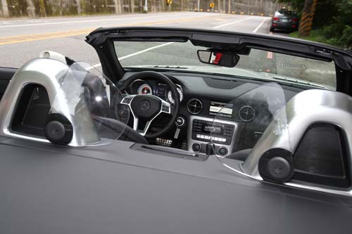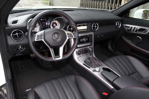 除此之外,本次試駕的SLK200豪華版還另外加裝了「AMG Sports Package跑車套裝配件」。在外觀上除了有AMG的前後擾流、側裙、5輻式輕合金輪圈、暗色頭燈燈框及尾燈,另外更重要的是在底盤設定上改列為標配的AMG跑車化懸吊系統,使車高降低 10 mm,並提供較為硬派的懸吊設定,在操控時對路面的反應更加直接敏感,使駕駛者能明確感受到車身動態與路面的變化,讓車主能享受熱血豐富的操控樂趣。內裝的部分則是包含了縱肋條紅色縫線座椅、賽車方格旗儀錶、Nappa真皮3輻附透氣孔跑車式方向盤、黑色AMG腳踏墊、以及相當搶眼的鮮紅色安全帶等,在在都讓這台SLK200的外型看起來更有殺氣。