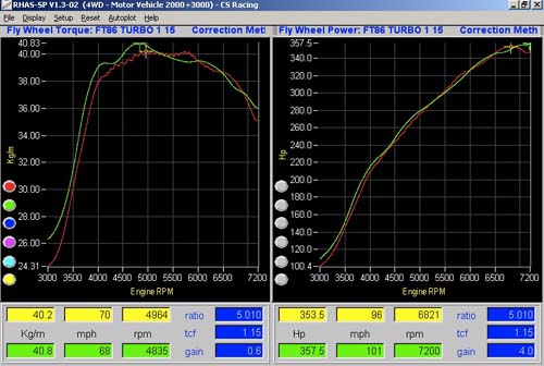 尚豪國際邱老闆為了瞭解這套GReddy turbo kit的實際效率如何?特別還安排了馬力機實際測試,以Dynapack馬力機進行測試,以日制SAE測試標準進行測試,測試過程中發生了離合器打滑的動力損失,但仍舊努力完成測試,經過測試後得到引擎馬力353.5匹、扭力40.2 kg-m的驚人數據,這與原廠公佈的200匹馬力輸出、20.9kg-m扭力效能比較,效能輸出上實在驚人!