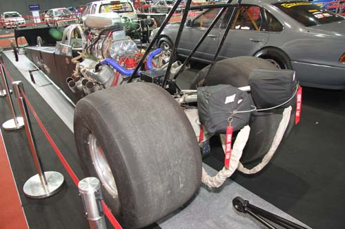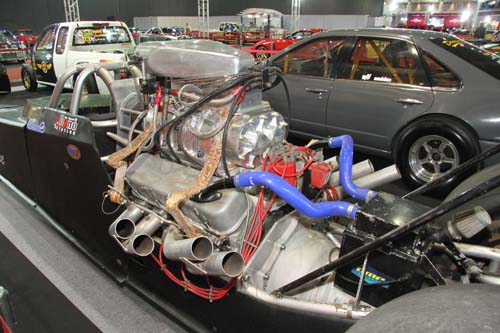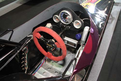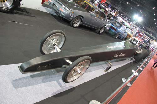 | 這部純正的直線加速賽車,外型就跟You Tube上看到的一樣,擁有極長車身、細小前輪,巨大後輪與車尾減速傘,V8引擎本體上還加掛一組龐大的機械增壓本體,而且沒有水箱設計,因為熱還來不及帶走就抵達終點,真是純種的動力怪獸。 |