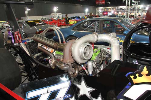 | 這部另一部直線加速賽車,車體雖然沒有那麼長,不過動力系統採用渦輪增壓加笑氣的方式來極度壓榨馬力,引擎應為日系直列六缸引擎,渦輪採用Garrett推出A/R值達69的本體,不用發動就讓人感到其強大的迫力。 |