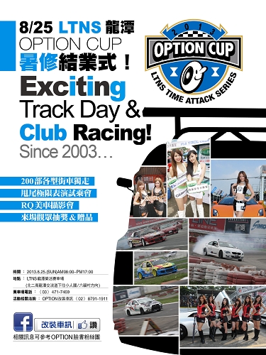 連續十一年於龍潭賽車場舉辦、最受國內車迷喜愛的OPTION CUP最速街車賽,2013年賽季Rd.2將於8/25在LTNS賽車場盛大舉行。當天預計除了將有來自12支俱樂部車隊,總計近200部的各型街車報名參賽,場外Dress Up視覺系美車展示、RQ攝影會與午間的M Project甩尾軍團表演試乘,保證會讓你在暑假的尾聲再次嗨翻天!