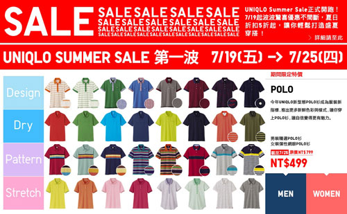 UNIQLO的夏日優惠Summer Sale強力登場!為體貼消費者荷包,自7月19日起,眾多熱銷商品驚喜下殺5折起,其中包括結合各式文化且具流行感的UT系列、經典款網眼POLO衫、水洗POLO衫、 POLO衫MB系列、清涼一夏AIRism Bratop輕盈涼感衣系列、家居外出皆適宜的男裝STETECO短褲、深受女性消費者喜愛的女裝七分緊身褲及輕便七分緊身褲系列,以及備受家長青睞的童裝系列輕便五分褲、輕便短褲及嬰兒DRY睡衣等,眾多商品提供消費者最優惠的購物選擇。不僅如此,Summer Sale波波驚喜不間斷,7/26與8/2隨即推出第2波及第3波的超值折扣,讓消費者以最優惠的價格購得UNIQLO的優質服飾,滿足消費者夏日穿搭的亮麗風采!