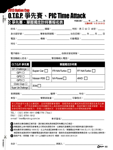 | OPTION改裝車訊會固定在每場賽前雜誌中內附報名參賽表格(最新一期收錄於八月號P.220~221),需報名者僅需填妥相關資料後傳真來函,編輯部即會受理並通知是否確認報名成功,之後再進行匯款動作即可。 |