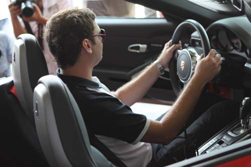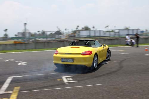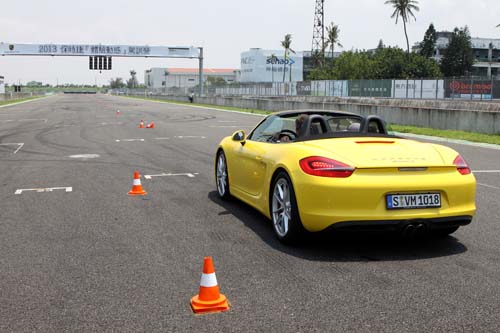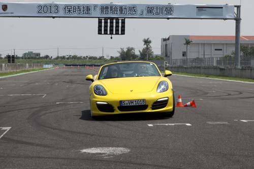 除了正確的繞錐方式,原廠教練刻意以誇張的滑胎方式繞錐藉此展現「入門」Boxster S的強勁性能表現。 |