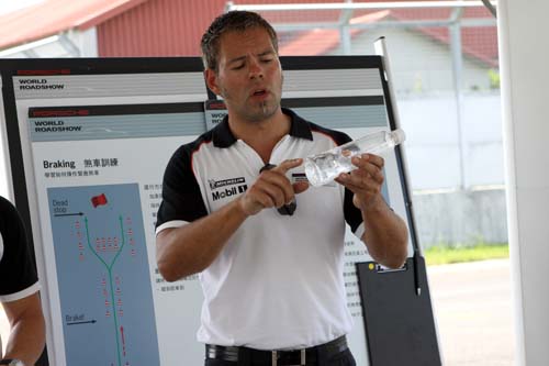 如何藉由精準掌控煞車與油門的銜接點才是Slalom繞錐訓練課程的關鍵,教練以「保特瓶」的解說方式讓學員得以充分理解其概念。 |