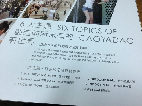 大魯閣草衙道基地面積26.306坪,預計的商業樓地板面積約30,600坪,零售佔47%、餐飲27.7%、娛樂25.3%(未計入鈴鹿賽道樂園之使用面積)。目前已順利完成主力店的招商,也在七月底順利通過都市設計審議及交通影響評估,預計明年第一季動工,全案在2015年第四季即可開幕營運。