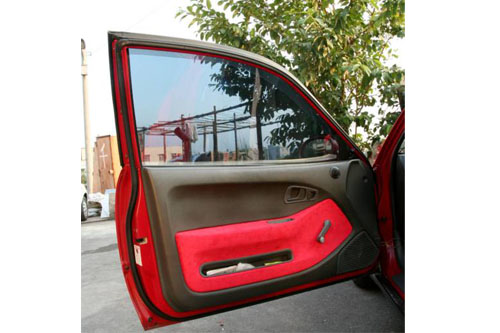 | 之後就可開始布料剪裁與黏貼的動作。這次使用的新布料為筆者在永樂市場二樓所購買到的紅色麂皮,售價一碼為360元,一般四門房車買個兩碼就夠用了。 |
