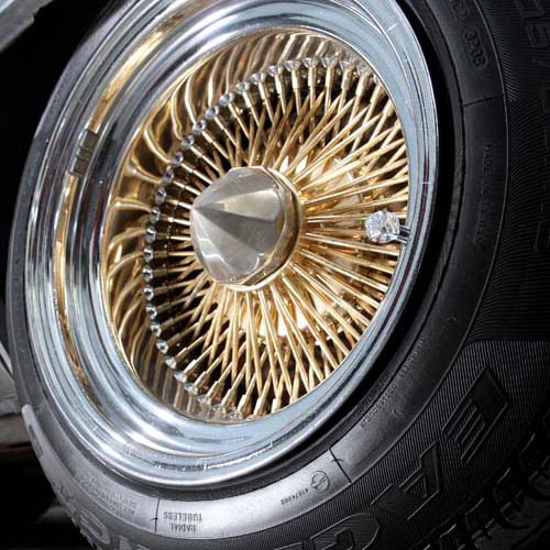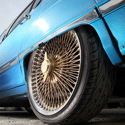 | 由於本車並未設定為跳跳車樣式,因此採用18吋的超大鋼絲圈搭配低扁平比輪胎,營造出Lowrider的氣勢。 |