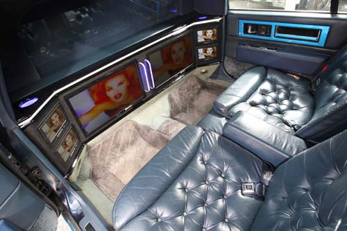 | 後座空間相當寬敞,而車主特別改裝了六具液晶螢幕與八支喇叭所組成的影音空間,但實際上耍噱頭的成分還是比較大。 |