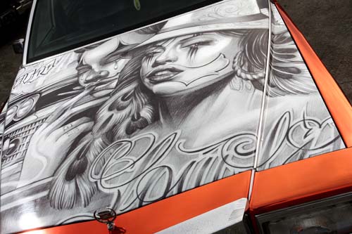 | 引擎蓋部分採用墨西哥常見的街頭塗鴉風格,這也是Lowrider的其中一個重要元素。 |