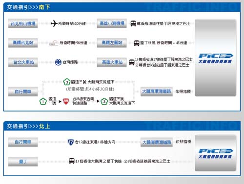 相信從沒去過屏東大鵬灣國際賽車場的人,一聽到屏東大鵬灣第一直覺反應就是~好遠唷,要怎麼去啊?這裡小編就將教導各位幾種可前往屏東大鵬灣不同的交通工具途徑:首先若從台北出發(此指南下),你可選擇從松山機場搭乘專機前往高雄小港機場,飛行航程約50分鐘,抵達小港機場後再轉搭省道縣往墾丁經東港之旅遊巴士。另外亦可選擇從台北車站搭乘高鐵,直達班次抵達高雄左營站的路程僅需96分鐘,接著可在左營站外搭乘「墾丁快線」巴士前往大鵬灣站下車(車程約45分鐘,成人車資每位146元)。另外亦可選擇從台北車站搭乘台鐵前往高雄火車站,抵達後轉乘省道17線往墾丁經東港之巴士,或轉乘88線往墾丁經東港之巴士。如果是自行開車的話其實也很簡單,從台北出發可直接行駛國道三號「二高」一路南下,直到最後末端下交流道就可直接打達進入大鵬灣風景園區環灣道路(車程約4個半小時)。若是行駛國道一號「一高」的話,則可從高雄轉接台88線東西向快速道路,再轉往國道三號大鵬灣交流道下。