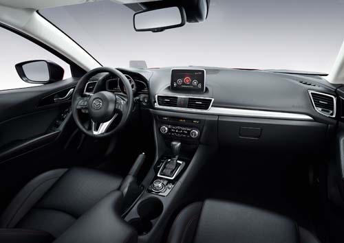 首次導入完整人因介面的新Mazda3,在中控檯上方配置了一部7吋的WVGA觸控式螢幕,整合資訊娛樂與安全導航系統,並可結合智慧型手機,收發e-mail、簡訊,或是瀏覽Facebook和Twitter。當然,駕駛也可利用新設置在排檔後方的操控旋鈕,進行閱覽資訊或操作所需的功能。對比上一代玲瑯滿目又複雜的設計,新車的中控檯更顯簡約清爽。新一代Mazda3的儀錶板的設計則由雙筒造型改為單筒呈現轉速、左右兩側分區表示檔位、油錶和溫度,儀錶板後方則有Active Driving Display抬頭顯示器,當車輛啟動時,能隨即翻起,並可顯示目前的車速與重要的駕駛資訊。