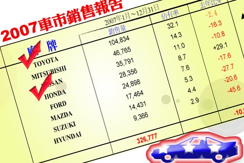 2007年新車市場靠著TOYOTA奮力一搏,12月結算前再度衝破萬輛關卡,達成總市場全年逾32萬輛的銷售成績,即使比2006年再度跌掉11%的銷售量,但比起今年來多數車商認為只有30萬輛的悲觀預期,稱得上差強人意。