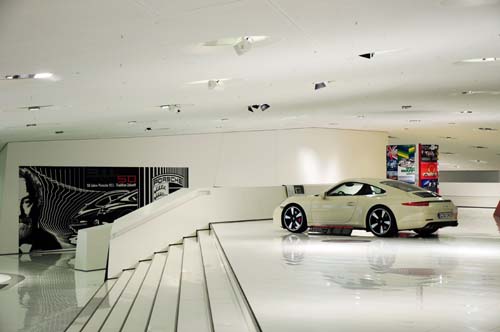 在博物館裡,Porsche當然也不忘擺上最新世代的911,上個月我們曾經提過Porsche為了慶祝911上市50週年,將要在法蘭克福車展中發表911五十週年紀念車,這部車當然也已經出現在博物館的展示區域裡,博物館的館長告訴我們,這部車在我們到訪前不久才運抵博物館,而這也是它首度向群眾公開亮相。