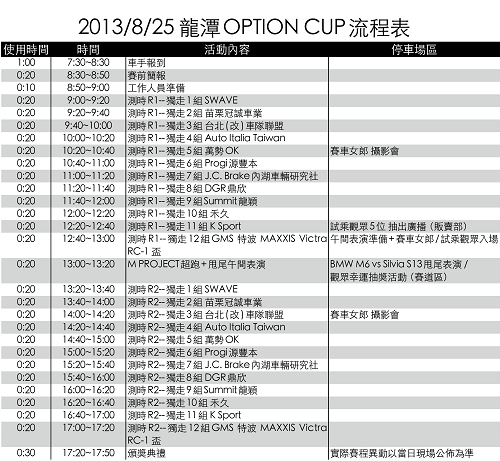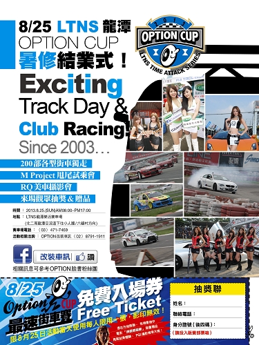 8/25來到龍潭現場的車迷朋友便有機會獲得限量OPTION CUP精美貼紙,以及可憑票根參加抽獎,獎品內容包含PQI Air Cam極限運動攝影機、BuddyClub高性能機油、司博耐油精與「RUSH決戰終點線」首映票等數十份優質大獎,以及10個幸運名額可參加甩尾表演試乘,邀您來現場見證。