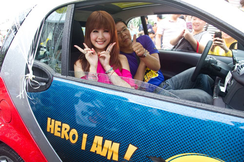 smart年度最大車聚活動「2013 Hero I am!smart城市英雄聯盟」上周末(8/24)於台中市市政北二路廣場熱烈展開,號召了近百位車主前來加入城市英雄的行列。雖然當天陰雨綿綿,但卻澆不熄熱情的車主及民眾們陸續湧入smart車主聚的會場!近百輛的smart 車隊,在甜心超人「安心亞」以及台灣賓士轎車業務行銷副總裁司達恆的帶領之下,進行了「Hero I am!英雄大遊行」,不僅吸引眾多圍觀民眾的目光,更為台中街頭注入smart特有的熱情與活力!