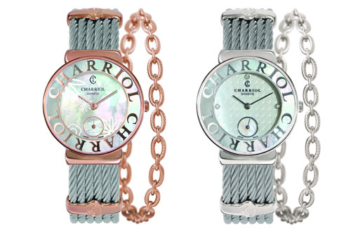 St-TropezTM 系列腕錶,以夏利豪的經典鋼索設計,搭配極具女性柔美印象的手鍊,俐落中不失優雅,充分展現出現代女性剛毅與溫柔兼具的特質。為迎接節奏輕快明亮的夏日,夏利豪推出St-TropezTM盛夏三重奏:St-TropezTM Sun,Seashells&Flowers腕錶,使用最新的貼花刻印技術,將此系列的三個主題形象幻化於錶盤,錶緣以重複出現的CHARRIOL字樣,半月型上下環繞著錶盤,搭配堅固的藍寶石鏡面,呈現完整的南法夏日風情,為度假中的美麗女子增添一份時尚光采。