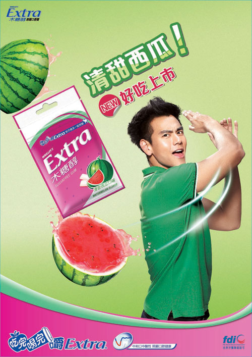 Extra Xylitol木糖醇無糖口香糖這次為迎接盛夏所推出的清甜西瓜新口味,香甜清爽又能照顧口腔健康。更邀請到擁有陽光般迷人微笑及健康完美牙齒的彭于晏擔任廣告中的男主角,並在廣告裡推薦大家Extra Xylitol木糖醇無糖口香糖清甜西瓜口味。這次在廣告中帥氣地徒手切開西瓜,專注認真的表情,十足清新帶勁!在畫面最後彭于晏露出對Extra Xylitol木糖醇無糖口香糖清甜西瓜口味垂涎三尺的模樣,令人忍不住也想即刻擁有。在炙熱的夏日午後以及三餐飯後,嚼兩粒Extra Xylitol木糖醇無糖口香糖,不僅輕鬆維持口腔潔淨,更讓人隨時散發健康迷人的笑容!