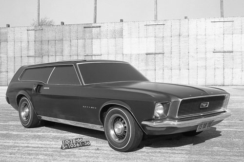 1966年野馬旅行車,60年代中期,福特曾認真考慮過另一種車型,就是旅行車。利用現有的轎跑車原型打造。所有已知三門設計的野馬旅行車,它的造型比傳統的美式家庭旅行車更接歐洲shooting brake的車型。(配圖3)