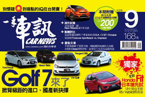 2013年《一手車訊》九月號除了有國民掀背車─Golf與其他對手的對決之外,還遠赴日本北海道帶來才將要在日本當地上市的Honda Fit、以及試駕後令人驚喜的全新Mazda 6;還有好可愛的Sion iQ也被我們抓來嘗鮮囉!