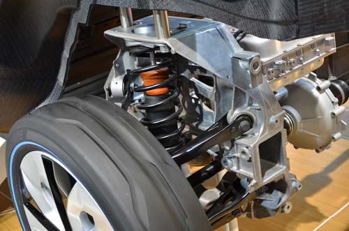 | 前懸吊系統採用簡單的麥花臣結構,但副樑與主結構仍採用鋁合金所製作。 |