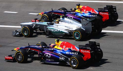 | 德國站L.Hamilton(中)起跑欲擋S.Vettel(右),結果被兩部Red Bull一起夾殺。 |