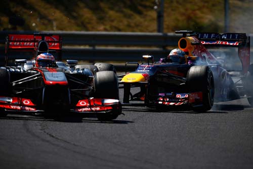| 匈牙利站S.Vettel首次休停後,落在J.Button後方長達10圈(直到J.Button休停),真是「倒了大楣」。 |