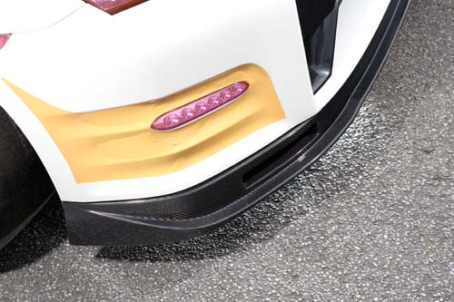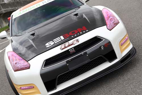 | 專為賽道進行改裝設定的Camber國旗號GTR,特別換上前後雙排開孔的碳纖維引擎蓋與2013年式專用前下巴,整體車頭重量減輕約3公斤,加上前下巴的空力輔助,讓車輛高速行駛時,可獲取大量進氣、散熱效益與穩定車頭輔助效力。 |