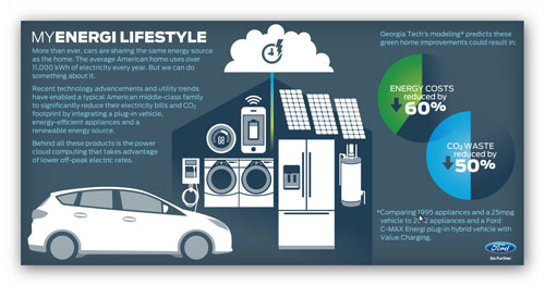 研究顯示,全球汽車數將在2050年成長至40億,而人口成長更將在我們有生之年成長至90億,如此高成長的車輛數和人口數將對新世代交通形成重大考驗。福特擘劃行動方案藍圖(Mobility Blueprint)多年,分近、中、長程階段拓展智慧交通解決方案,與各地政府共同研擬各階段智慧交通解決方案,不僅推出與時俱進而為人們需求量身打造的車款,更積極與產官學界推動基礎建設或研擬更具節能環保意識的生活型態。以Ford MyEnergi Lifestyle®為例,該綠能合作計畫藉由整合家庭用電與插電式電動車技術,大幅降低電費及二氧化碳排放量,實現節能的生活型態。當一個美國家庭採取MyEnergi Lifestyle®節能生活型態後,將能減少60%的能源成本,並減少超過9,000公斤的二氧化碳排放量,相當於降低了55%,這對環境保護是一大貢獻。