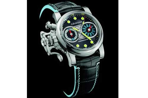 結合Graham自始以來對於精準度與堅固性的要求,展現出大錶冠系列更多面向的特質,土耳其藍色計時刻度及鮮紅計時指針搭配拋亮精鋼錶殼,呈現霓虹般的復古色彩。黑色鱷魚皮錶帶款也同時可透過藍寶石水晶後底蓋,看見更多機芯的細節之處。