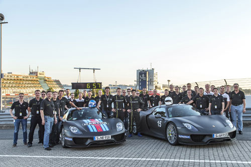 第一部擁有全球道路驗證的跑車 Porsche 918 Spyder 以不到七分鐘的時間征服全長 20.6 公里的紐柏林北賽道。這部混合動力超跑創下了 6 分鐘 57 秒的實際單圈成績,比前次記錄足足縮短了 14 秒。德國保時捷汽車公司 (Porsche AG) 負責產品研發的管理委員 Wolfgang Hatz 表示: 「我們對 918 Spyder 有莫大的期許,那就是重新定義駕駛樂趣、效率與性能,而現在,我們已做到了。」