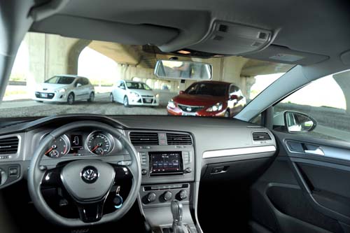 新一代Golf座艙延續上一代設計,不論配備或是格局皆沒有過多的新奇,但並不表示配備豐富性不足,向來安全配備頗為豐富的Golf,新一代車型則維持既有特色,於安全配備方面,Golf則是相當完善,除了EBD、BAS、ESP、ASR、XDS等一應俱全外,更有著其他對手所欠缺的膝部氣囊,這也讓Golf有著共計七具氣囊達本次之冠,此外,另有配置本次唯一的電子手煞車及胎壓偵測系統,同時也具有Start/Stop怠速起閉系統,不僅對於油耗有所助益,更是新式代科技的體現。Golf雖安全配備豐富,但於娛樂性方面則較為欠缺,雖有配置5.8吋觸控螢幕及整合外接音源功能,但卻未能有衛星導航及倒車攝影等配備,不然以Golf的安全、操控、價格來說,若增添此配備則勢必難逢敵手。